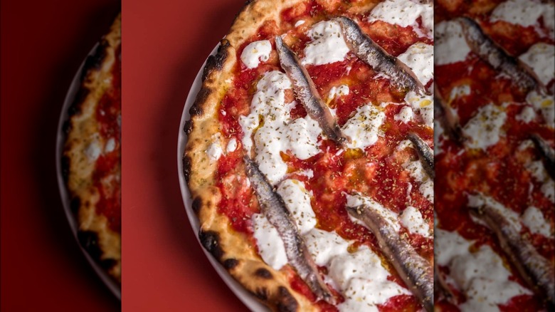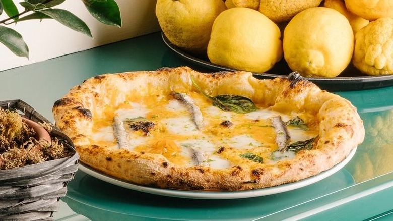 The la Maio may sound like a mayonnaise-based pizza, but its name is actually based on the chef's last name, Maiorano. The pie happens to have placed among the top pizzas at the 2019 Pizza World Championship in Parma. Made with yellow tomato sauce, yellow Datterini, anchovies, olives, burrata, and olive oil, it is an ode to some of Italy's best ingredients.