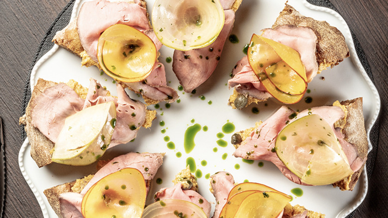 Vitello tonnato, a starter comprised of slices of veal accompanied by a mayo-like sauce made with tuna and eggs, is a popular dish in Turin and surrounding regions. So it comes as no surprise that someone has found a way to successfully turn it into a pizza topping. Sestogusto is that someone, and it's done it by topping a barley flour-based dough with the aforementioned tuna sauce, local beef, marinated turnips, capers, a parsley emulsion, and herbs.