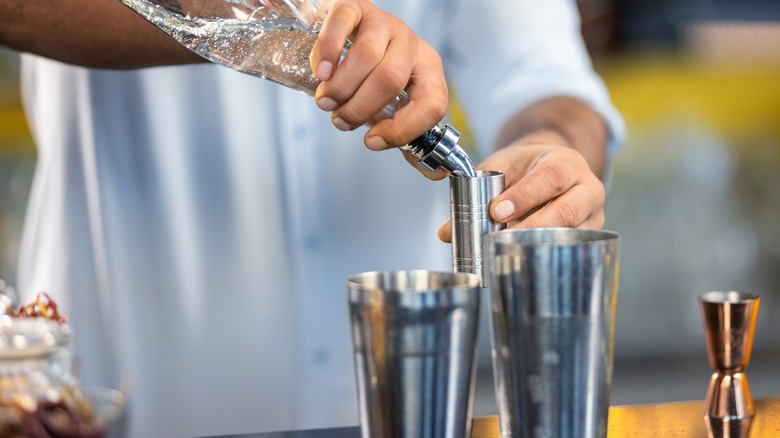 If you're planning on making lots of cocktails — for a party, perhaps — you should consider pre-batching to save time and your arm muscles. Pre-batching cocktails is fairly straightforward but requires a little know-how. You want to start by combining the scaled-up quantities of your cosmo ingredients in a large container, but it's easy to forget that ice contributes an extra ingredient — water. Working out how much water to add requires some kitchen scales and a bit of math, as you'll need to calculate the difference in weight and, subsequently, volume, between the unshaken cocktail ingredients and a finished drink. Once you know how much water to add, you can bottle, shake, and chill your cocktail mixture until you're ready to pour.