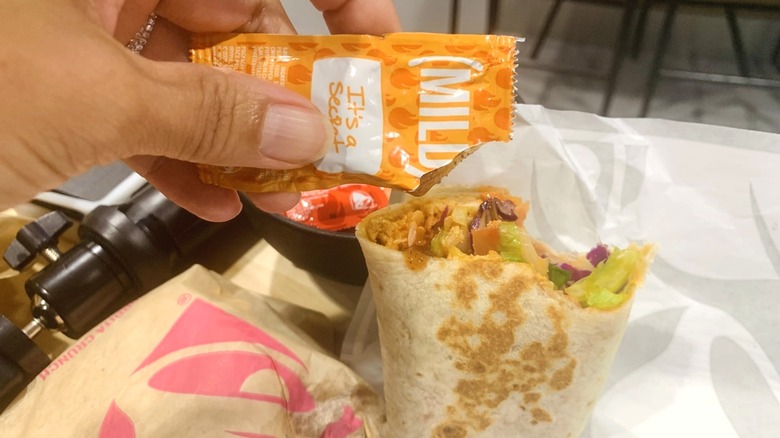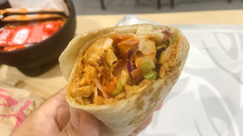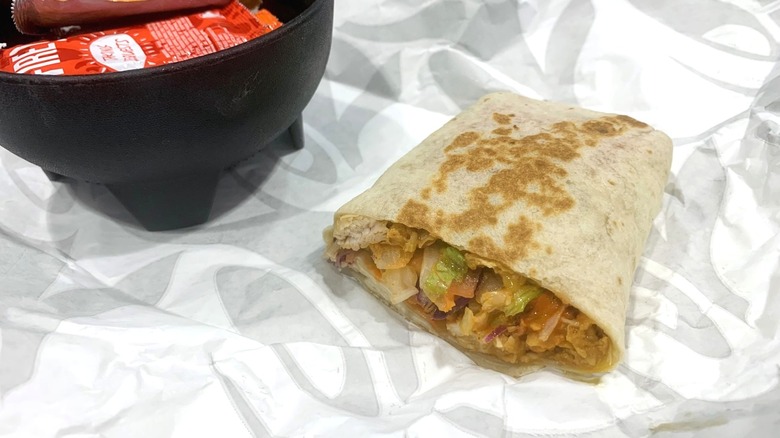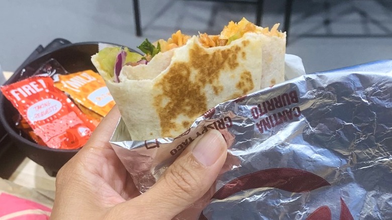 Overall, the burrito offers a satisfying range of textures, from the crunch of the veggies and the moistness of the chicken to the chew of the flour tortilla — though the tortilla could have benefited from a little more time on the grill to make it firmer. While the burrito comes with a packet of Avocado Verde Salsa (like the other Cantina Chicken Menu items), it's hardly necessary — the Caliente Sauce is bold, flavorful, and sufficient. So, save that Avocado Verde Salsa packet and employ it on other items, such as those from Taco Bell's secret menu.