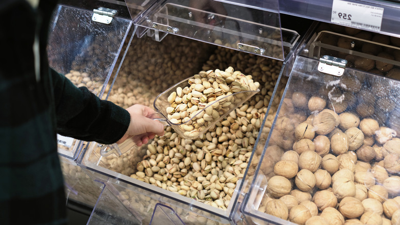 For another way to practice sustainable shopping, buy your most-used dry goods from the bulk section of the supermarket. This can "help reduce packaging, particularly when you bring your own reusable containers," says Jackie Suggitt. Examples of such vessels include fabric drawstring bags, glass jars, and clean takeout containers, although some stores might offer small brown paper bags. Likewise, shopping in the bulk section will help cut back on food waste, as you'll be able to purchase only what you need for a particular recipe, notes Suggitt. For instance, "If you only need 1 cup of rice, you can buy just 1 cup [instead of] a 25-pound bag of it," says Anne-Marie Bonneau.