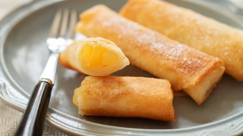 We wouldn't blame you if you walked past the egg roll wrappers in the chilled produce section of the grocery store without thinking twice. Hidden behind all of those containers of salsa and guacamole, or perhaps shrouded behind the smaller wonton wrappers, are the large flour-based egg roll wrappers used for DIY Chinese takeout appetizers. Sure, you could buy them and try stuffing them with a range of savory fillings, including everything from vegetables to meat. But perhaps an even better use for these egg roll wrappers is for all things sweet.