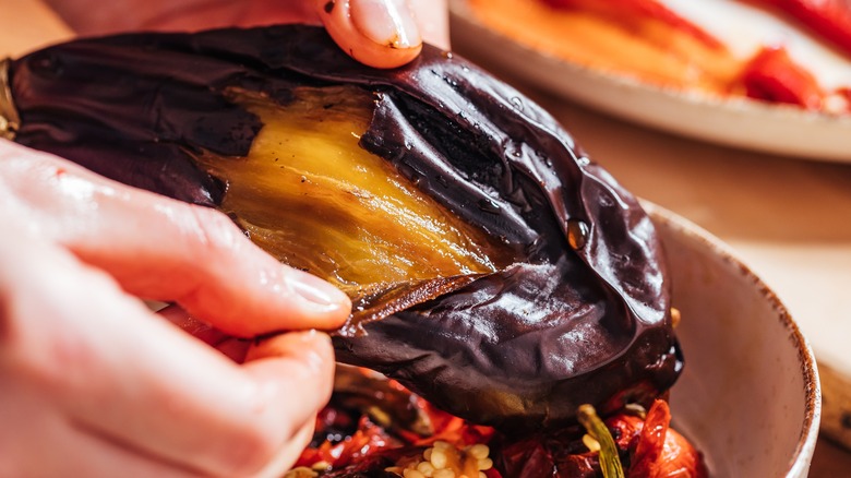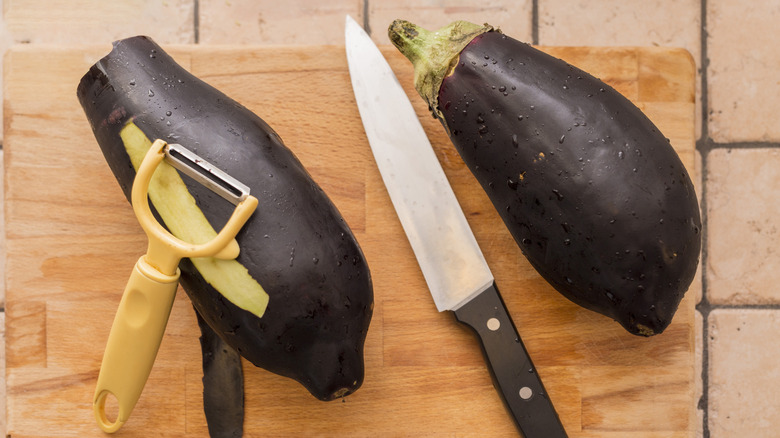 There's always a little debate between home cooks about whether it's necessary to peel an eggplant. Depending on how you cook it, the skin may sometimes make the texture a little tougher, and some believe the skin is the part of the fruit to blame for the bitter taste. So, a lot of people think peeling an eggplant is the solution to avoiding all this. However, as the skin contains a lot of flavor and even some beneficial antioxidants, it should be noted that it's not necessary to peel an eggplant — unless a recipe explicitly depends on a skinless eggplant.