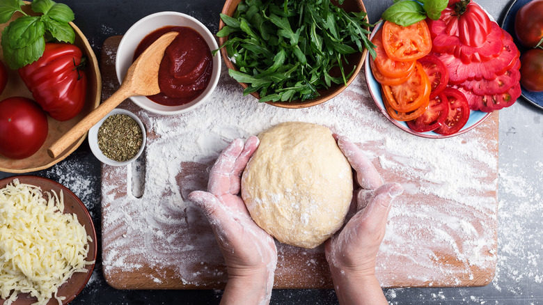 Making pizza dough at home requires only a few ingredients that you probably already have in the pantry. And once you find the right recipe for the style of crust that you prefer, homemade pizza beats anything you can get from take out. Plus, it's a fun thing to do with friends or family. And if you want to give your favorite dough a flavorful makeover, we have the answer. Andrea Congiusta, executive chef at Pasta Beach, told Tasting Table that the easiest way to add extra pizzazz to your pizza is by making your dough with a flavored or infused oil.