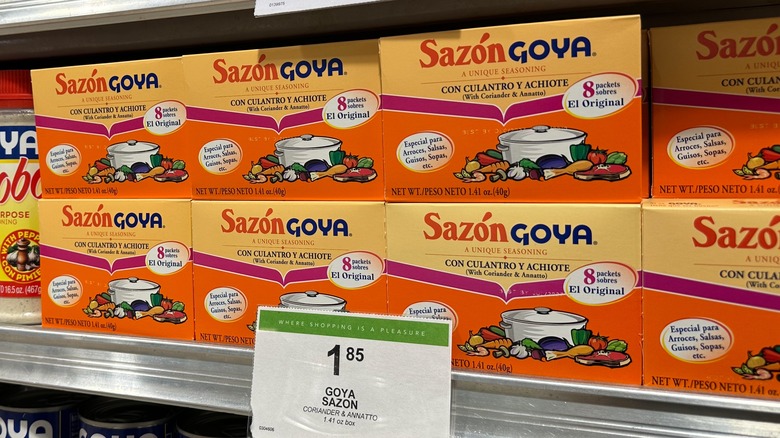 We all know that taco seasoning is not just meant for ground meat tucked inside a crunchy shell — it's a versatile spice mix that adds flavor to many things, from beer can chicken to skirt steak fajitas and BBQ. After all, taco seasoning is not a Mexican creation but was instead invented by a German Texan to season meat chili. Combining smoky ground chiles and paprika with cumin, onion powder, garlic powder, salt, and pepper, taco seasoning adds a zippy flavor to many dishes. But what if we told you that there is a similar spice that will give you all that Latin flavor with a Caribbean twist? Enter Sazón, Puerto Rico's own spice blend, which is used on practically everything on the Island of Enchantment.