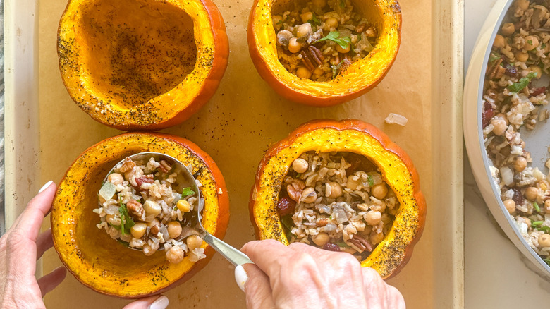 - When the pumpkins are done, stuff them with the rice mixture and return them to the oven for 10 minutes.