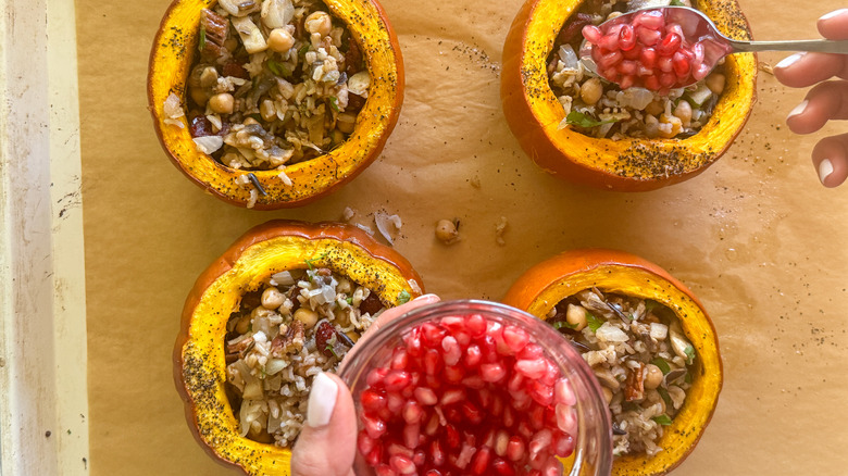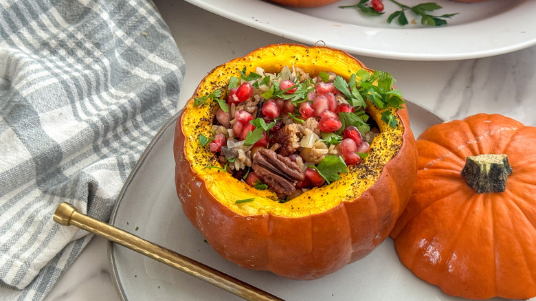 If you're looking for an impressive vegan entree for fall entertaining that ticks all the cozy autumnal food boxes, we've got you covered. These vegan stuffed pumpkins use small, individual sugar pumpkins as an edible bowl, which is filled with a savory combination of wild rice, chickpeas, dried fruit, and nuts. The fall seasonings, fresh herbs, and pomegranate arils make this dish as bright and delicious as it is festive. It's a surprisingly simple process and can be easily doubled or tripled depending on the size of your group.