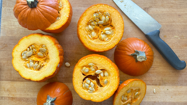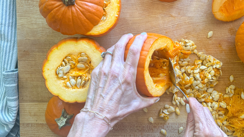- Scoop out the insides of both pieces of each pumpkin and discard the seeds or save to roast.