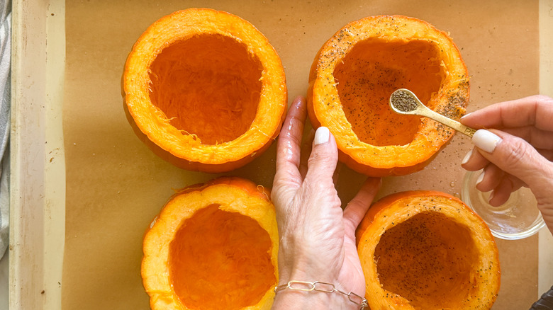 - Place the pumpkins on a baking sheet, brush the insides with 2 tablespoons of the oil, add ½ teaspoon salt and the pepper, and roast for 30-40 minutes or until tender but still holding their shape.