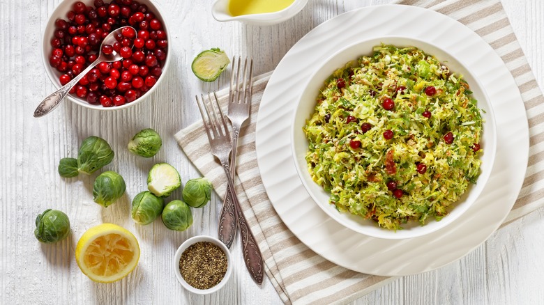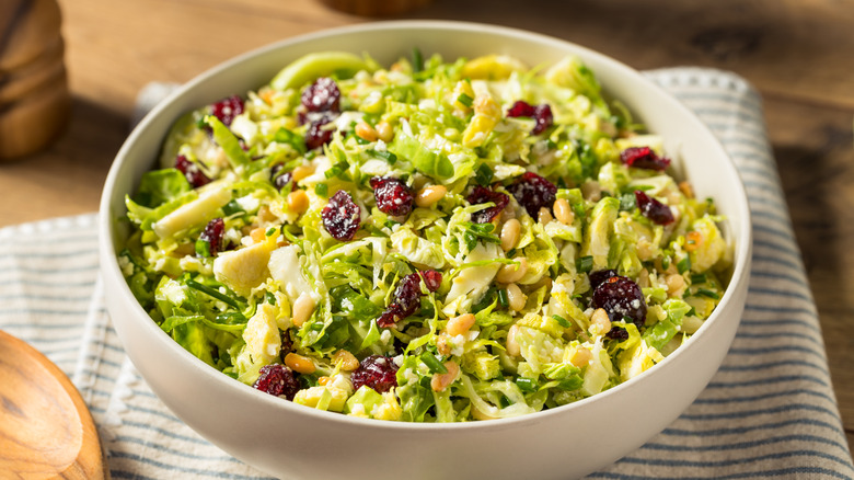 The good news is there are different ways to make coleslaw, and even more ways to boost the flavors of your go-to recipes. Create a Mediterranean-leaning coleslaw with your shredded Brussels sprouts providing a bitter backbone for refreshing mint, tart pomegranate seeds, earthy-sweet pistachios, zesty za'atar, salty and creamy feta, and tangy white wine vinegar. Or, go Italian with basil, sage, parsley, and fennel, plus toasted pine nuts, shaved parmesan, lemon juice, and olive oil. If you're building a recipe entirely from scratch, think about fall ingredients and flavors — you want sweetness, tartness, richness, and spice to balance the sprouts' bitterness, which could come from dried fruits like cranberries, nuts like walnuts, cheeses like smoked gouda, and spices like cardamom and coriander. There's huge potential with your dressing — try a warming spin with woody, bourbon-boosted coleslaw, or whip up a vinaigrette with sweet, earthy pumpkin.