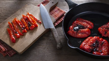 For whole peppers, you'll rotate them with tongs for even charring. Quarters or thirds will blister in less than a minute. Once roasted, place the peppers in a plastic bag or a glass container with a top so they can sweat for 5 to 10 minutes. The charred, bubbly skin will slide off with a brush of your finger. You can peel the skin off under a cold faucet to speed the process along. Roasted red peppers will bring a smoky, sweet, and vegetal flavor to sauces, soups, sandwiches, and dips. Blend them into a romesco sauce to serve with a Spanish tortilla or dice them up and add them to a creamy pimento cheese dip. Use them instead of fresh peppers in a red pepper soup for even more depth.