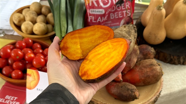 Originally attempting to create a beet with yellow and red concentric circles (similar to a candy-stripped beet), Row 7 began breeding out the "beety" qualities many people dislike, attempting to create something more widely approachable — a "gateway beet," as Irwin calls it. To achieve this, the team turned to a gene bank to find the perfect specimen. They bred this rare red beet with a more standard yellow beet and slowly but surely achieved their goal. (Though, sadly, they never achieved the circles.) The Badger Flame beet has vibrant orange-red skin and mostly yellow flesh, with an almost watercolor-like quality being the only hint at its superficial past.