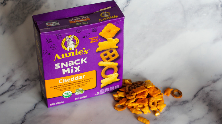 Each of the ingredients in this snack mix was oddly buttery. The pretzels were the only thing crunchy about it — and even those rings and squares weren't crisp enough for my liking. It felt like I was eating butter crackers with every other component, from the cheddar bunnies to the "healthy" Cheez-Its. There was no textural diversity in this mix, which made for a sad bite for each individual component of the mix, as well as a bite altogether.