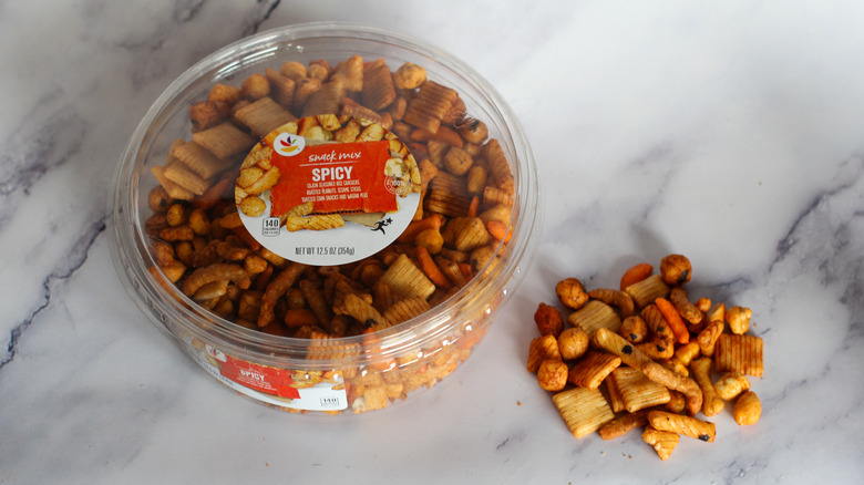 These snack mixes are basically comprised of an assortment of ingredients — whether it be chips, crackers, nuts, or seeds — in the same container. It's important to note that snack mix (or pub mix, as it's otherwise called) is not the same thing as trail mix, which is comprised mostly of nuts and seeds. While you might want to use your trail mix as a power-up when you're out on a hike, I'd like to think that snack mix is made for couch potato-ing. It's salty, it's savory, and it will send your hand back into the container for "just another handful."