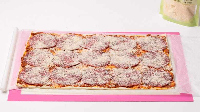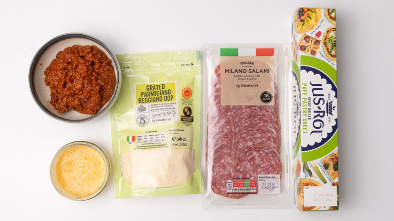 To begin this easy muffuletta party pinwheels recipe, first, you will need to gather the ingredients. You will want a pack of ready-rolled puff pastry, olive tapenade, sliced salami, grated Parmesan, and a beaten egg.