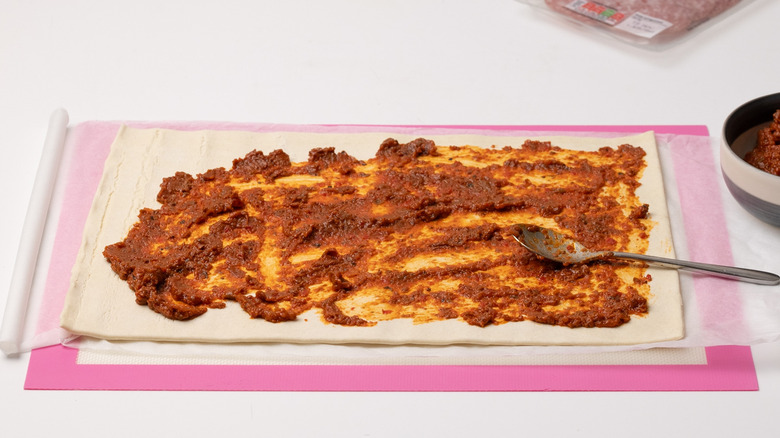 - Spread the olive tapenade onto the pastry, making sure to get it to the edges.