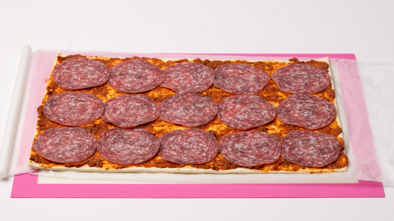 Remove the pastry from the fridge and carefully slice it into thin rounds.