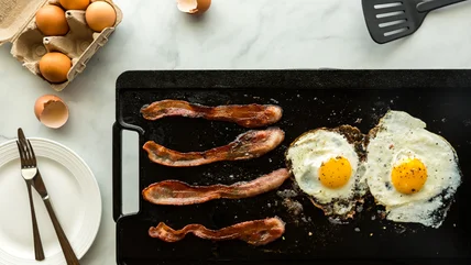 The griddle makes it easier than ever to whip up a large batch of soft and fluffy scrambled eggs, evenly cooked with plenty of air incorporated into them. For scrambled eggs, always start by cracking your eggs into a bowl, not directly onto the griddle. Use salt as a finishing sprinkle rather than a main ingredient to avoid creating rubbery eggs. Whisk the eggs well until the yolks and whites are well combined, then add a splash of water to encourage steam, which will improve the texture by creating a fluffier egg.