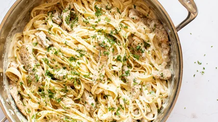 Like vodka sauce or spaghetti and meatballs, fettuccine Alfredo is an Italian American favorite that draws from the simplicity of traditional Italian cuisine. Alfredo sauce is an easy yet decadently rich blend of butter, cream, and cheese simmered with aromatics into a creamy coating for fettuccine. While the sauce makes the dish, chicken is one of the most popular proteins to round out fettuccine Alfredo. Cooking your Alfredo sauce in the same skillet as your chicken is an important step in imparting extra flavor to the sauce, as well as a handy way to save using multiple pans.