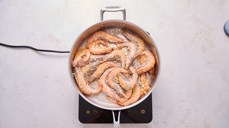 Add the shrimp and cook until slightly pink on either side, about 2–3 minutes. The shrimp will not be cooked all the way through.