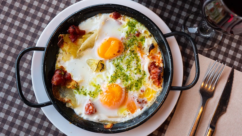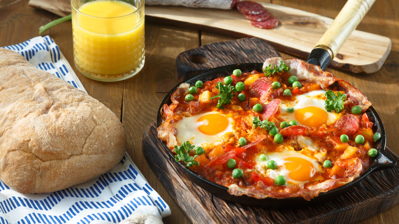 Flamenco eggs, sometimes called gypsy eggs in other countries, is a colorful, nourishing dish that hails from Andalusia, the southernmost, predominantly agricultural region of Spain — and the birthplace of this eponymous folkloric music. Generally baked in a round terracotta pan, it consists of potatoes, peas, and smoky chorizo smothered in a tomato and roasted peppers sauce and topped with cracked eggs and Serrano ham. It's typically considered a first course and served with some crusty baguette or toast for dipping.