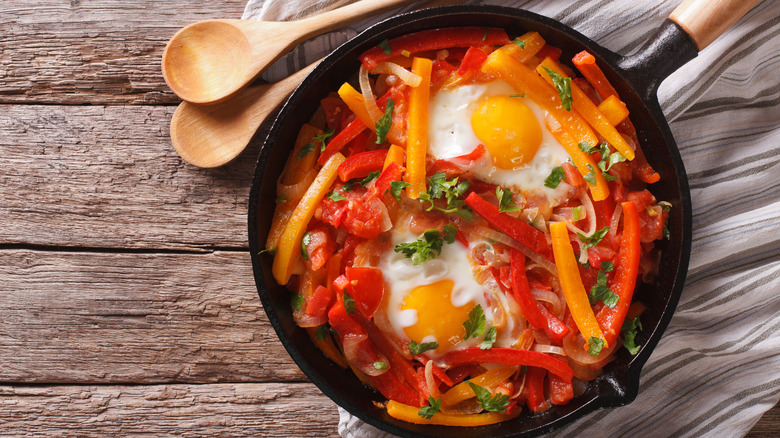 Eggs piperade is a vibrant and rich dish from the northern Basque region that is typically prepared in a skillet from creamy eggs, various types and colors of bell peppers, sweet smoked paprika, tomatoes, onions, and extra virgin olive oil. Mat Schuster specifically advises against skimping on the oil. "It not only fries the peppers," he remarks, "but [it also] adds a tremendous amount of flavor."