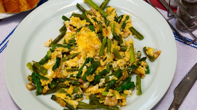 Scrambled eggs don't have to be boring or plain in terms of flavor and texture. This creamy and fragrant dish, for instance, consists of scrambled eggs mixed with tender garlic shoots, prawns, extra virgin olive oil, and, occasionally, wild asparagus and ham shavings. There is also a variation with added parsley and/or chopped chistorra, which is a type of semi-cured chorizo mainly produced in the Basque, Navarra, or Aragon regions.