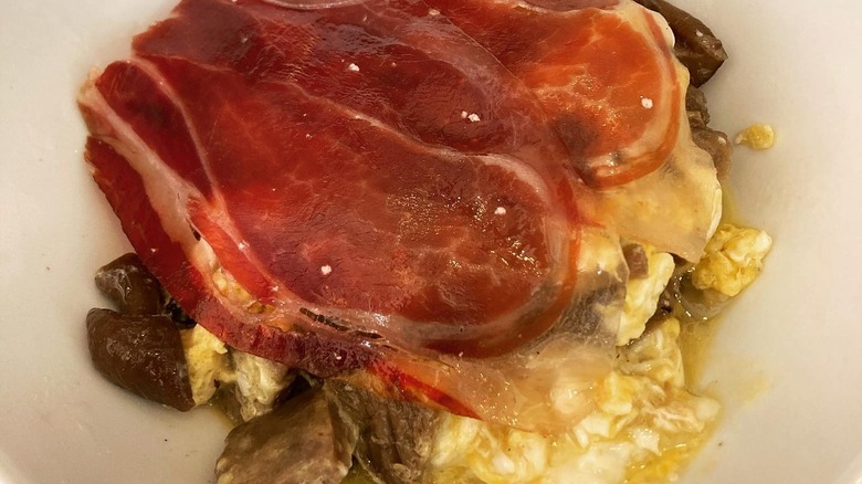 This popular dish combines scrambled eggs with any type of cured ham, such as jamón Ibérico, garlic-sautéed wild mushrooms (boletus or oyster, for instance), chopped garlic cloves, and sherry vinegar or white wine. The plate is then garnished with chopped parsley, served with crispy bread, and ideally paired with a Fino sherry — a dry white wine from palomino grapes — per Mat Schuster's recommendation.