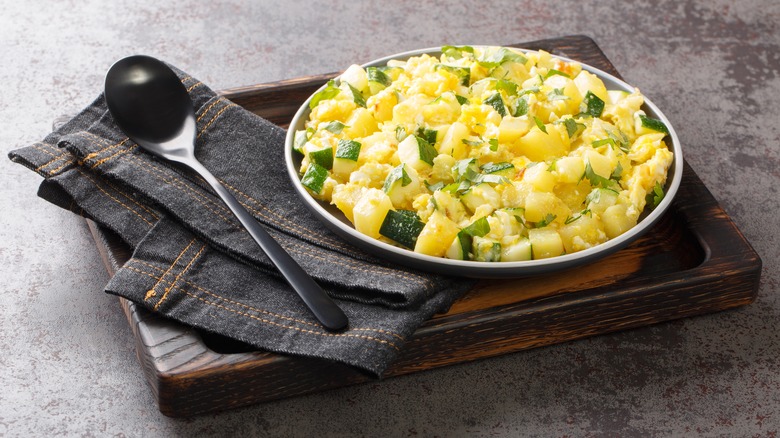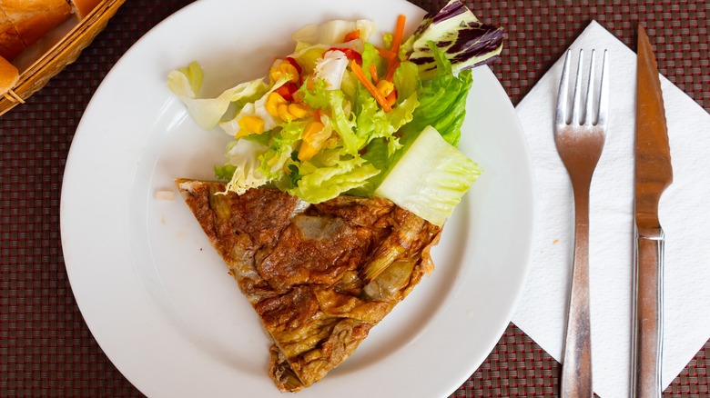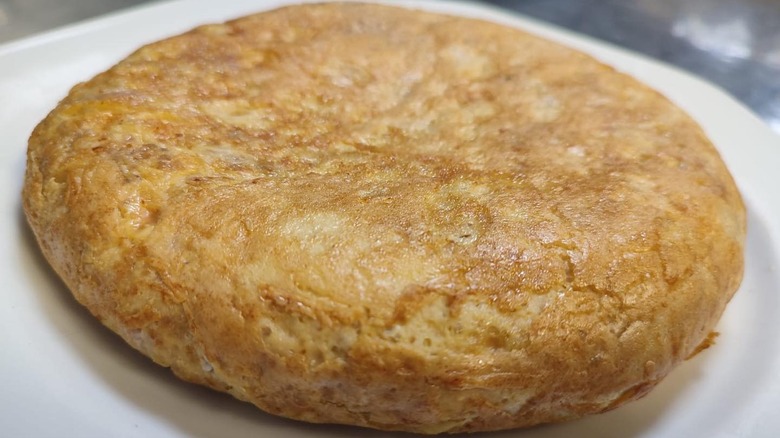 According to Mat Schuster, this dish is a staple in Spanish homes and pairs well with beer, and he advises against baking it in the oven or hurrying the steps. The batter, "which should be the consistency of wet stew," needs to be poured over a hot nonstick pan over some olive oil. "Then," he adds, "reduce the heat of the pan and gently cook until there is enough of a wall of cooked egg to flip, and continue to cook on the other side." For inspiration, his own personal variation additionally includes green onion, bay shrimp, BBQ brisket, or morcilla (spiced blood sausage).