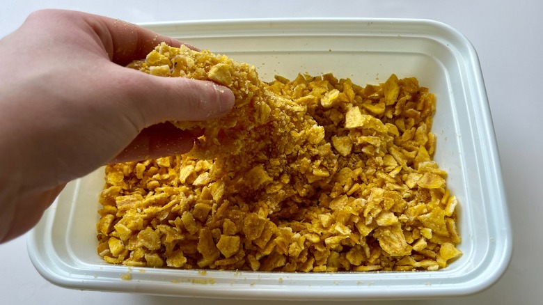 Chicken fingers have been encrusted in so many various crumbles over the years, including cornflakes, potato chips, almonds, and coconut flakes. One ingredient that's a stellar option that may have never crossed your mind? plantain chips. In addition to generally being gluten-free, this unique fruit coating gives chicken fingers a better crunch than traditional breadcrumbs or corn cereals, and adds a hint of sweetness. While they are related, plantains are generally less sweet than bananas, so they won't overpower the chicken. If you've ever snacked on a plantain chip before, you know how particularly crunchy they are — and that they are usually thicker and more substantial than potato or tortilla chips.