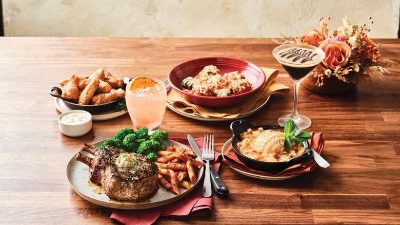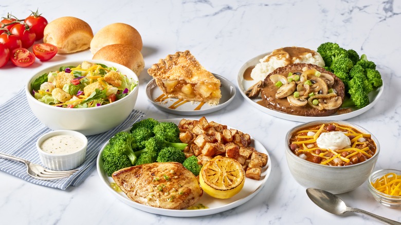 Along with new fare, Bob Evans is also touting new deals and even more value with the coveted promotion of dinner for two starting at $22.99. Two starters kick off the meal with a choice between a farmhouse garden side salad and a cup of slow-simmered soup. Guests can then choose two entrees, with choices like the chicken-n-noodles deep-dish or country-fried steak. For a $5 upgrade, options like the slow-roasted turkey and dressing and steak tips dinner are also on the table. Lastly, all comes to an end with a dessert to share. Among them are autumnal pies like pumpkin, apple, or pecan, but an ice cream sundae and rich Holy Cow Chocolate Cake are offered as well.