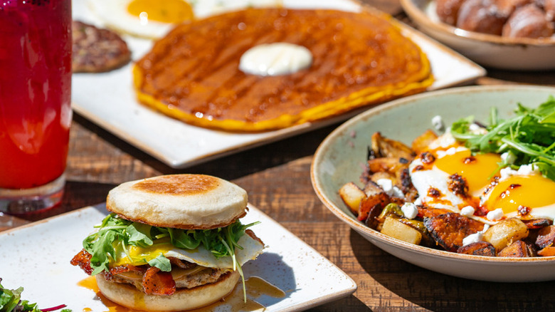 The Million Dollar Breakfast Sandwich is as good as it sounds — think pork sausage, egg, smoked bacon baked with brown sugar, black pepper, cayenne, and maple syrup. Add gouda and fresh arugula on top of the English muffin creation and cue the pure autumn bliss. Meanwhile, the honey bacon Brussels hash is a masterpiece in and of itself, skillfully combining bacon and roasted Brussels sprouts with a potato hash full of cheese, onions, and egg, all adorned with a chili crisp drizzle. To wash everything down, beverages like the honey caramel crunch iced coffee, cinnamon toast cereal milk, and Blackberry Bramble Sangria are available.