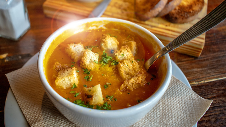 Soup of the day is supposed to be different every day, prepared fresh and exclusive to the daily menu. But Ramsay advised caution even if you think it sounds good. "Ask what yesterday's soup du jour was before today's special. It may be the case that it's the soup du month," he mused. When soup of the day is not made fresh, it's likely cooked in large batches and then served over several days, therefore belonging on the list of soups you should never order. Ramsay's warning reminds us of an old episode of "Kitchen Nightmares," in which he found out from the server that the soup of the day listed on the menu had actually been served every day that week. Later in the episode, Ramsay hilariously discovered the restaurant owner had no idea the phrase meant a different soup each day. Definitely check if the restaurant you're dining at understands the purpose of this dish.