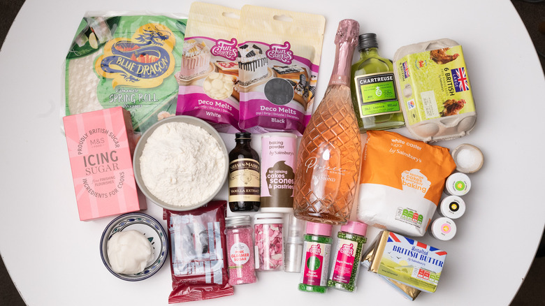 To begin this "Wicked" layer cake recipe, first you will need to gather the ingredients. To make the pink and green sponge cakes you will need all-purpose flour, baking powder, salt, butter, granulated sugar, eggs, vanilla extract, and pink and green gel food coloring. To make the cake soaks, you will want more granulated sugar as well as rosé Prosecco and Green Chartreuse. To make the buttercream you will need more butter, vanilla extract, plenty of confectioners' sugar, and the pink and green gel food coloring. Finally, you will need a variety of ingredients for the decorations: Vietnamese spring roll wrappers (they're the ones made with rice paper), white fondant icing, black fondant icing, white candy melts, black candy melts, pink and green sprinkles, edible glitter, and of course, more pink and green gel food coloring. To complete assembling the cakes you will also want a few cocktail sticks and a wooden skewer.