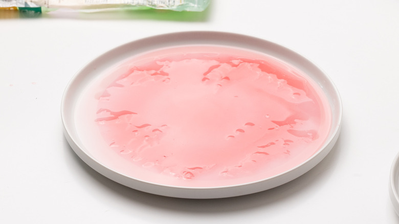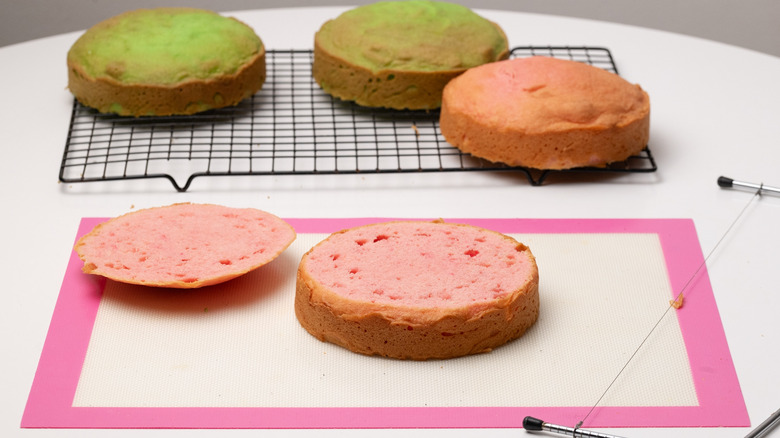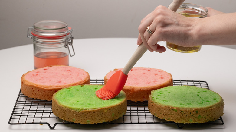 - Using a pastry brush, brush the green sponges with the chartreuse cake soak and the pink sponges with the Prosecco soak.