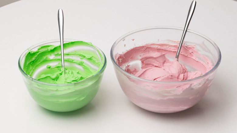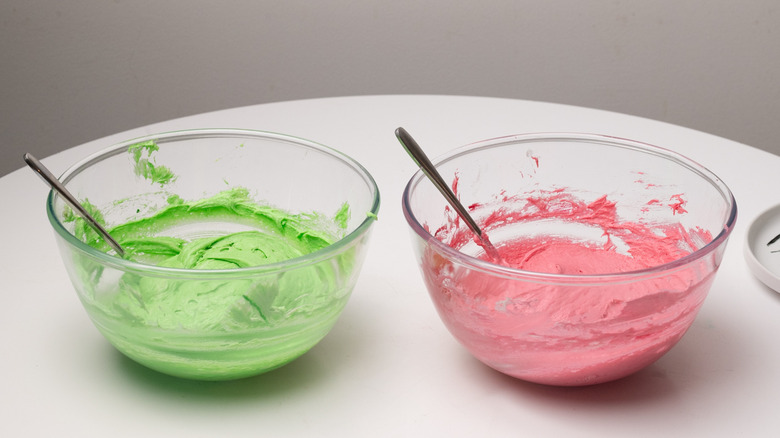 - Divide the buttercream icing into two bowls, setting one aside. Divide the remaining portion (one half) of buttercream into two more halves (a fourth of your total buttercream). Use gel coloring to dye one pink and the other green.