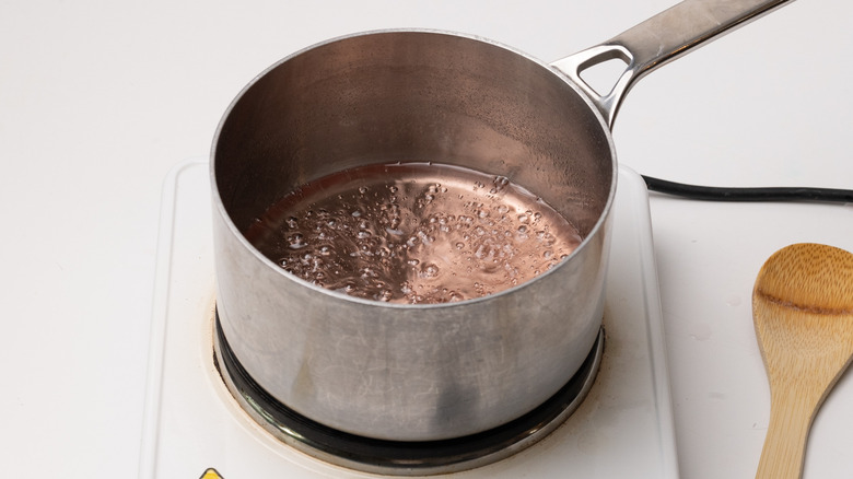 To make the pink cake soak, add 1 cup granulated sugar and rosé Prosecco to a small saucepan. Heat the saucepan to a medium-high temperature and allow the mixture to simmer until the sugar has fully dissolved and the liquid has reduced by half. Set the soak to one side to cool completely.