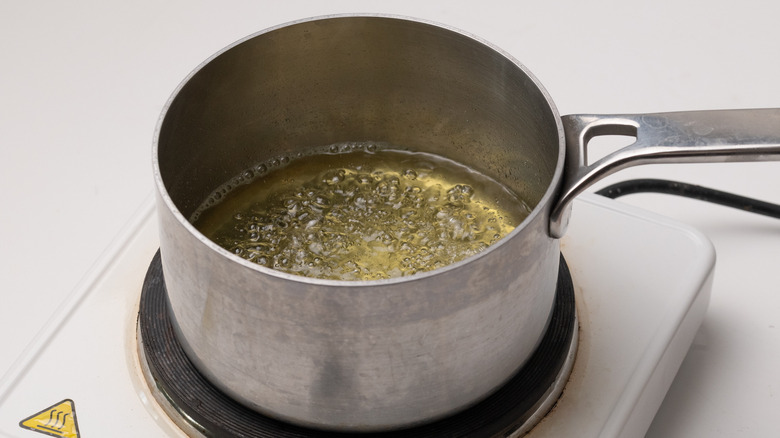 To make the chartreuse cake soak, add 1 cup of sugar, the chartreuse, and ⅔ cup water to a saucepan. Heat the chartreuse mixture over a medium-high temperature and simmer until the sugar has fully dissolved and the liquid is reduced by half. Set the chartreuse soak aside to cool completely.