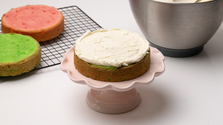 - Using a cake board or cake stand, place one of the green sponges into the center. Spread a spoonful or two of the neutral-colored buttercream on top of the sponge. Place a pink sponge on top of the first sponge and top with more buttercream.