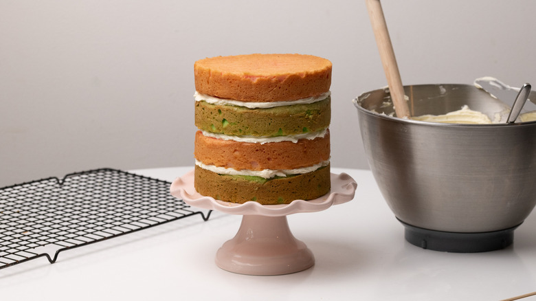 Repeat the process, alternating the green and pink sponges between the neutral buttercream until all the sponges are used up.