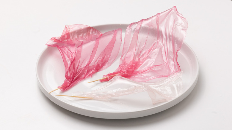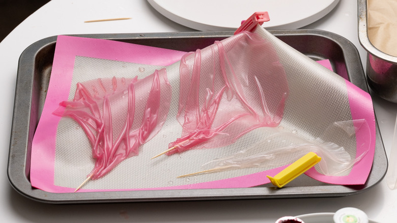 Start by prepping the rice paper sails: Add approximately ⅓ cup water to a plate, along with a few drops of pink or green food coloring. Place a spring roll wrapper into the colored water and let it soften for 1 minute. Transfer the soft spring roll wrapper to a silicone baking mat, shaping it as desired.