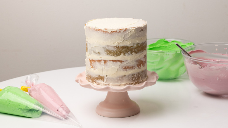 - Using the remaining plain buttercream, coat the entire cake in a thin layer and smooth it out to form a crumb coating. Transfer the cake to the fridge for at least 20 minutes for the crumb coating to harden.