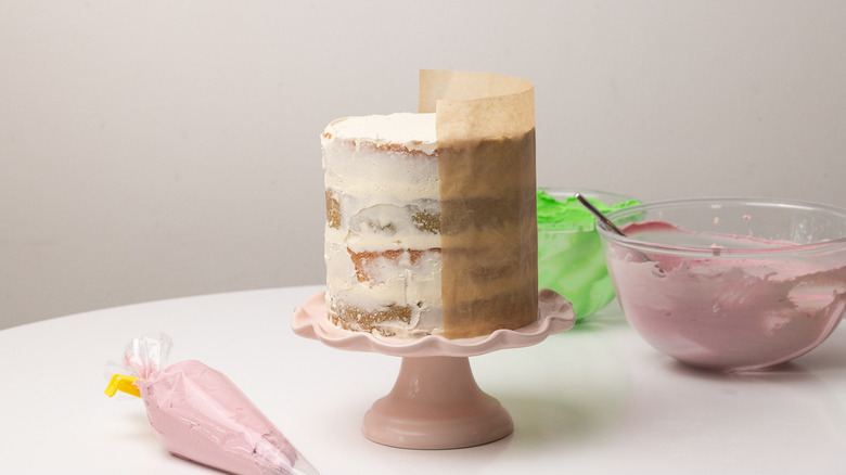 - Cut a piece of parchment paper to cover half of the cake and carefully wrap it around the outside of the hardened crumb coating.