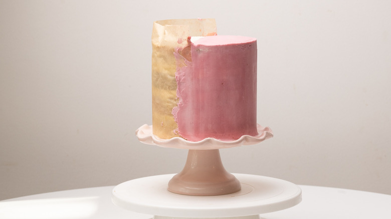 - Remove the cake from the fridge and carefully peel off the baking paper to reveal the other side of the cake. Using a clean piece of baking paper, cover the hardened pink buttercream, leaving the other side of the cake exposed.