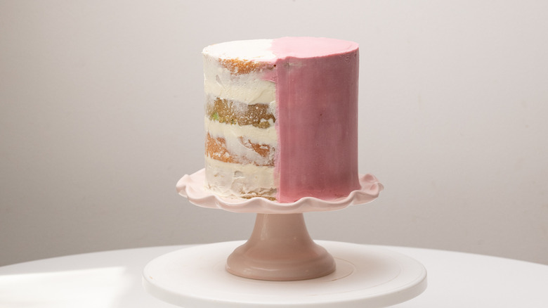 Pipe the pink buttercream onto the exposed half of the cake, using a cake knife to smooth it out. Place the cake back in the fridge for at least 20 minutes for the pink buttercream to harden.