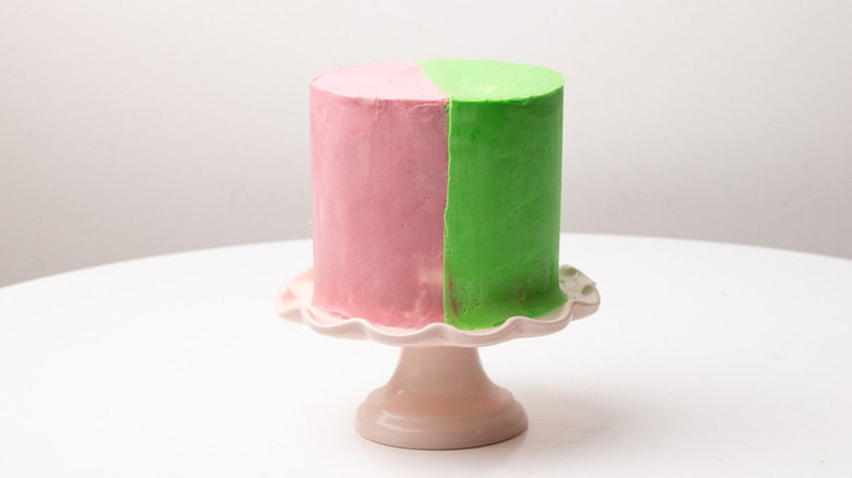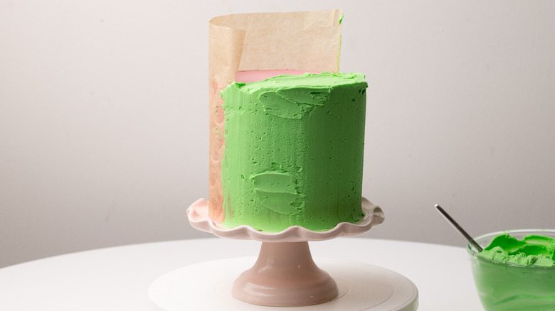 - Pipe the green buttercream onto the exposed half of the cake, using a cake knife to smooth it out. Place the cake in the fridge for another 20 minutes to allow the green buttercream to harden.
