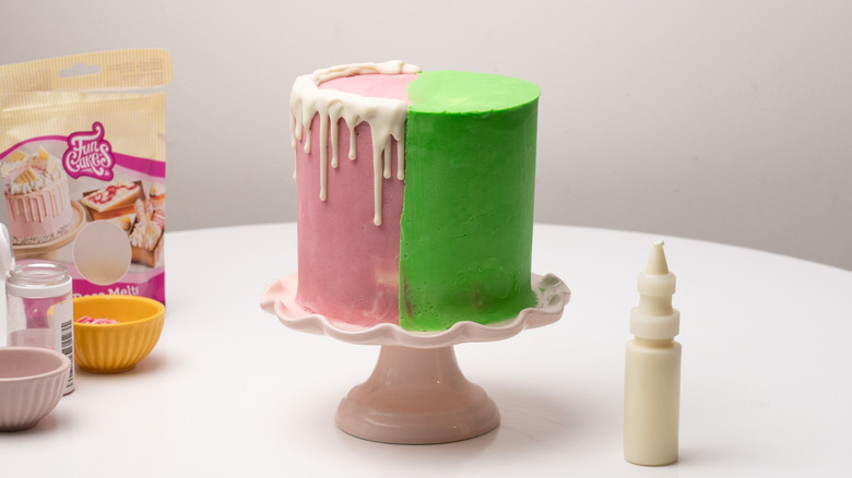 - Transfer the mixture to a squeeze bottle, or alternatively use a spoon, and drip the white mixture down the pink side of the cake.