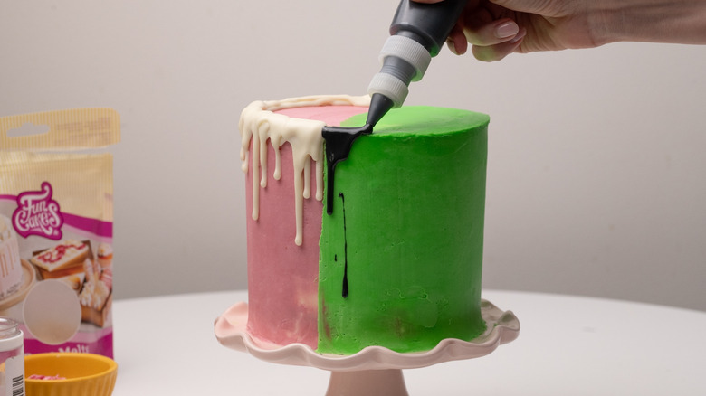 Repeat this process using the black candy melts, using them to form drips on the green side of the cake.