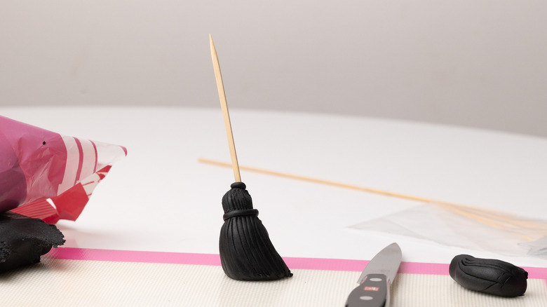 To form the broom, wrap the remaining 1 ounce of black fondant icing around the base of a wooden skewer, and use a knife to draw lines in the broom base. Set hats and broom aside to dry.