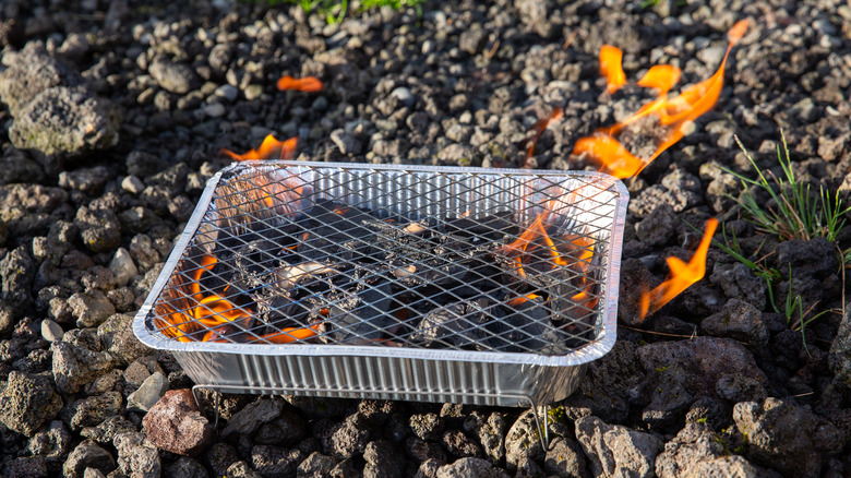 The biggest con of disposable grills, however, is the safety issue. They're a massive fire hazard when not used responsibly. In 2022, some U.K. retailers announced they would no longer be selling disposable grills due to their problematic connection to wildfires. Disposable grills should only be used on a stone surface, absolutely not on grass or wood. Although many grills do come with a metal stand, it's not enough — the heat from the charcoal will still severely burn the surface underneath it. As the grills are only intended for single use, they also create a ton of non-recyclable waste — though it is possible to find portable disposable grills made out of cardboard and bamboo.